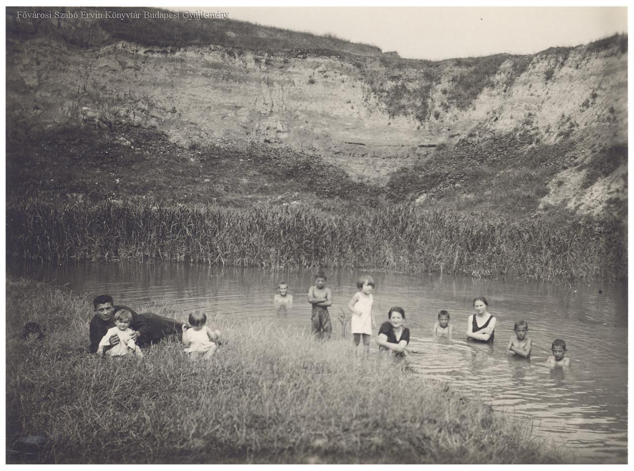bányató, tégla- és cserépipar, fürdőzés, nő, gyermek, fürdőruha, életkép, 1920-as évek