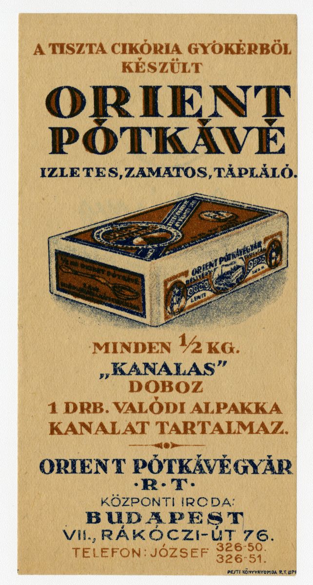 ital, élvezeti cikk, doboz, zamat, íz, cikória, pótkávé, kávé, kávézás, kanál, reklámnyomtatvány, kisnyomtatvány, aprónyomtatvány, számolócédula
