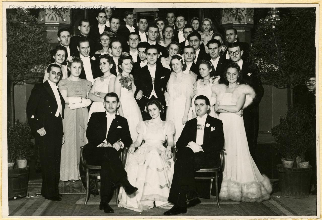 bál, felső osztály, középosztály, jogász, diákélet, társasági élet, nő, férfi, ifjúság, ünneplőruha, estélyi ruha, farsang, csoportkép, 1930-as évek