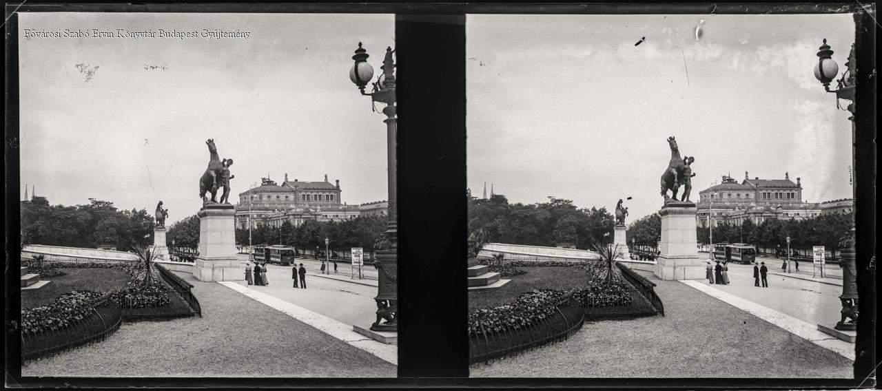 utcakép, szobor, park, körút, közúti villamosvasút, ember, férfi, nő, színház