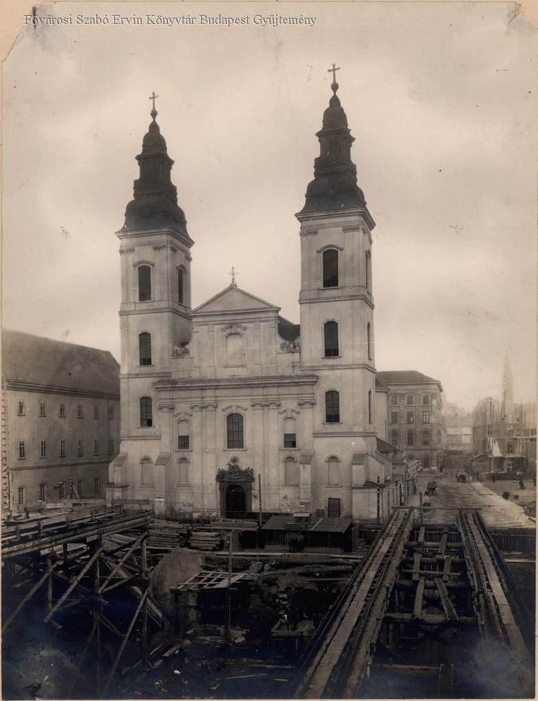 Baloldalt a piarista rendház részlete. A régi Városháza még áll (1900-ig) a templom mögött. Épülőfélben az egyik Klotild-palota, az Osztálysorsjáték palota még nem épül. Előtérben gerendák