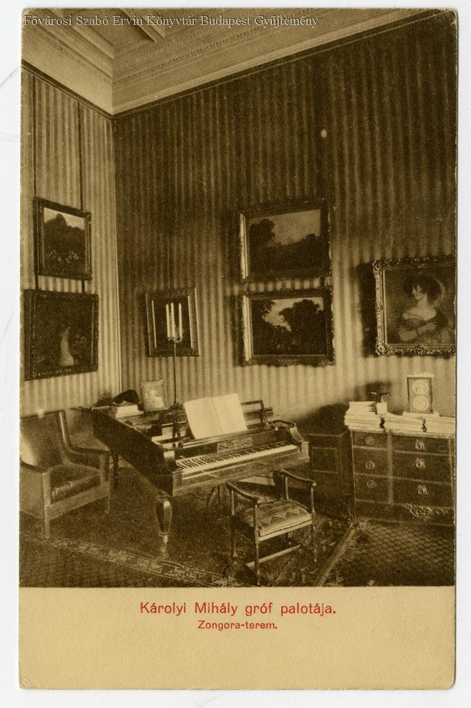 képes levelezőlap, palota, belső felvétel, zongora, festmény, ülőbútor, szőnyeg, szekrény, 1910-es évek