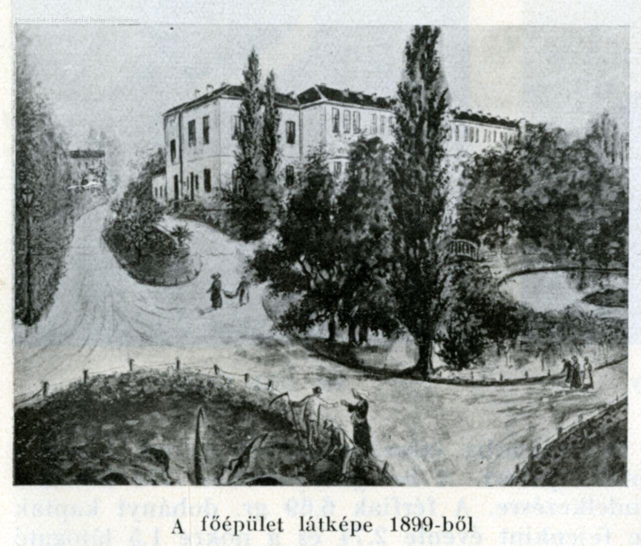 [Az angyalföldi elmebeteg ápolda helyszínrajza, homlokzatai, a főépület látképe 1899-ből és földszinti alaprajza]