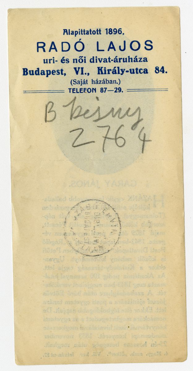 Cégnév:Radó Lajos Úri- és Női Divat-áruháza