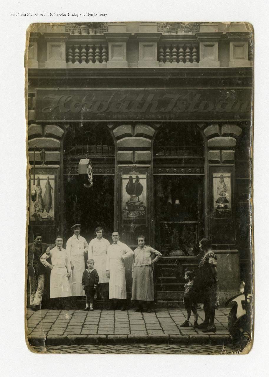 [Horváth István hentes mester családtagjai és munkatársai körében boltja előtt]