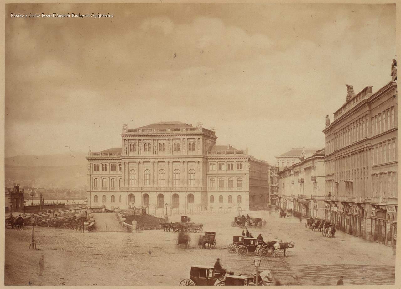 tudományos intézmény, szálloda, palota, fiáker, lovas kocsi, épületkép, utcakép, 1872