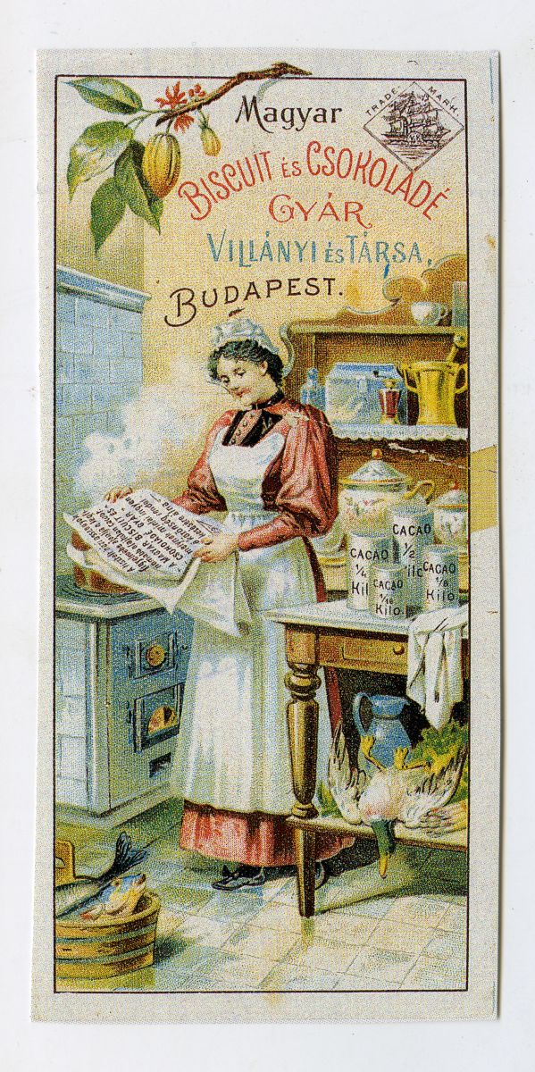 olvasás, nő, védjegy, kakaó, kakaósdoboz, kakaófa, edény, daráló, tűzhely, asztal, korsó, vadkacsa, konyha, kötény, főzés, csempe, fejkendő, újság, hal, tál, reklámnyomtatvány, kisnyomtatvány, aprónyomtatvány, számolócédula
