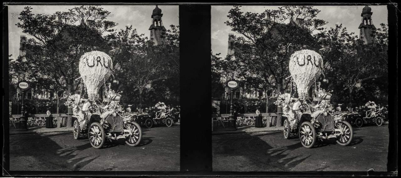 [Virágkorzó a Stefánia úton, Brüll Alfréd autója] [Floral corso on Stefánia Road, Alfréd Brüll's car]