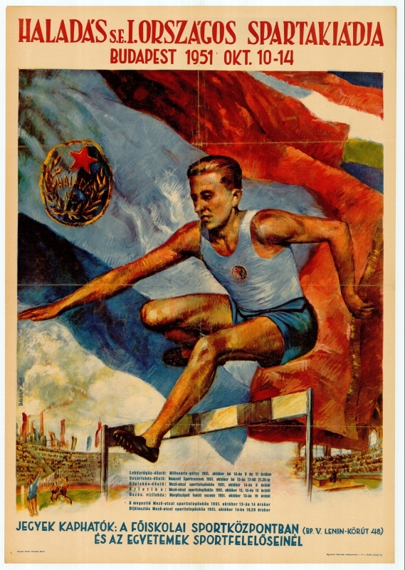 A Haladás sportegyesület első országos, 1951-es spartakiád eseményének reklámplakátja. A plakát egy gátfutó sportembert ábrázol, a háttérben nemzeti zászlók. A bal oldalon a Haladás sporegyesület emblémája látható, benne a kommunizmus jellegzetes jelképeivel: egy vörös csilaggal és búzakalásszal.
