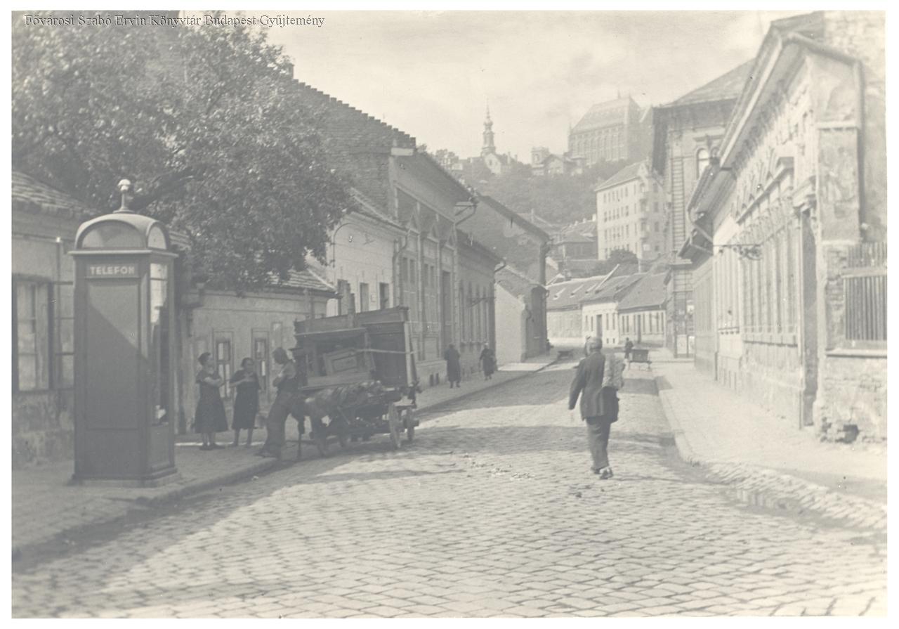 Telefonfülke, a bútorokkal megpakolt kocsi mellett támaszkodó férfi két nővel beszélget. Háttérben az Országos Levéltár és a Bécsi kapu téri templom