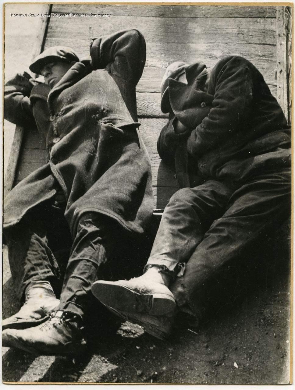 [Két nyomorúságos öltözetű férfi alszik egy kézikocsin a Teleki téren, 1940 húsvét idején]