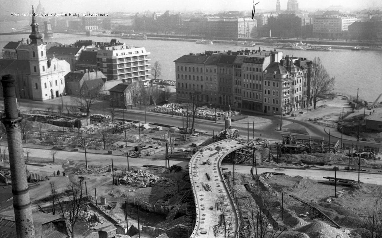 [A Döbrentei téri felüljáró építése, a Gellérthegyről nézve]