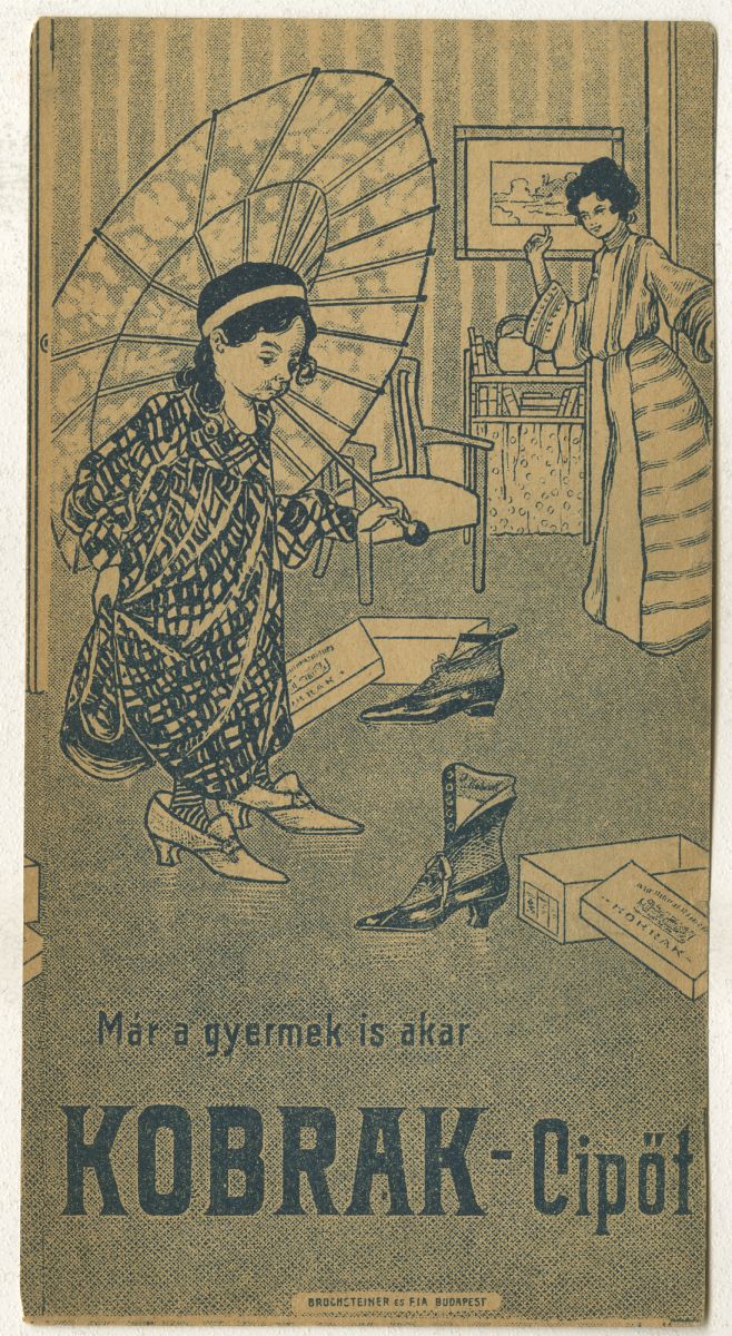 anya, nő, magassarkú cipő, kislány, doboz, lakás, szoba, japán ernyő, humor, reklámnyomtatvány, kisnyomtatvány, aprónyomtatvány, számolócédula