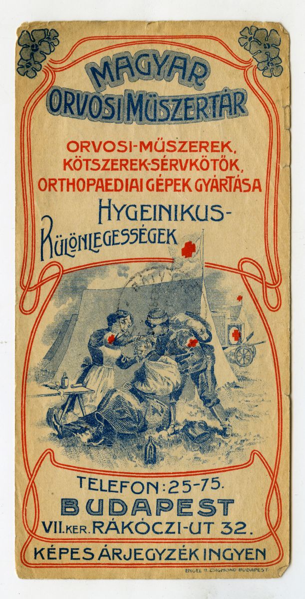katona, sebesült, sebesülés, áru, ár, orvos, ápoló, nő, férfi, sátor, kocsi, kerék, kereszt, üveg, asztal, kötszer, olaj, tubus, seb, ápolás, kezelés, fertőtlenítés, higiénia, gyógymód, gyógyítás, szalag, reklámnyomtatvány, kisnyomtatvány, aprónyomtatvány, számolócédula