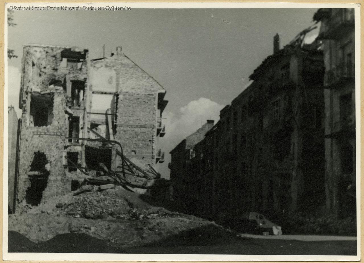 A Kék Gyolyó utca irányából. T-34-es tank torony nélküli roncsa