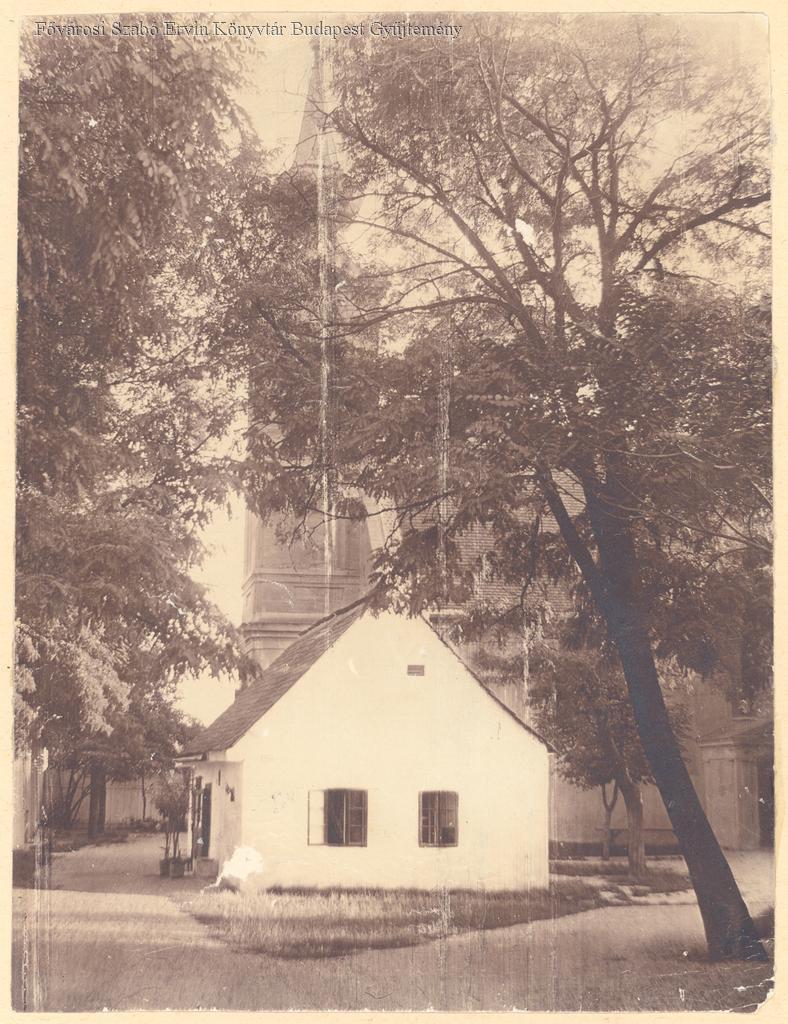 [Óbudai református templom előtérben a paplak épülete]