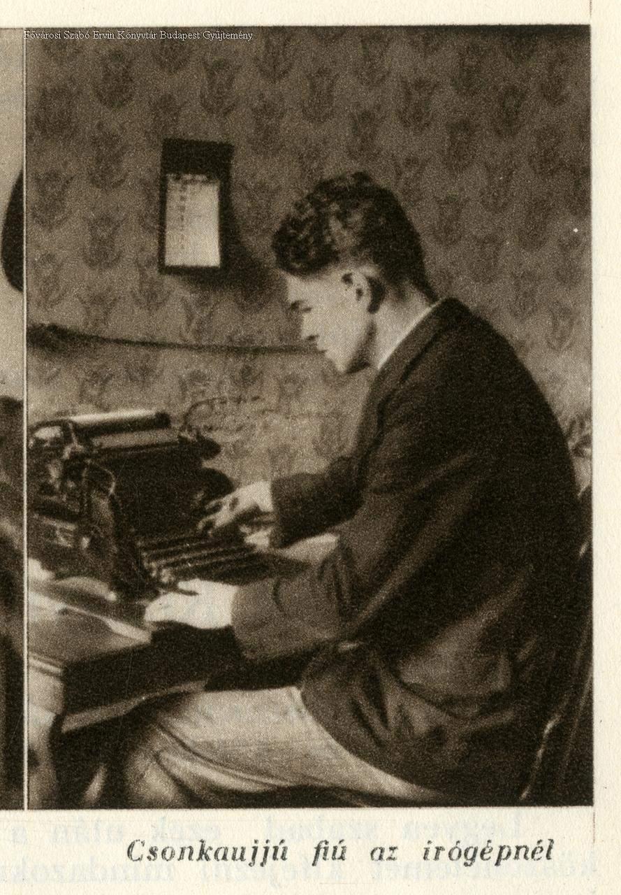 Eredeti képaláírások: "Béna lábú cipész munka közben"; "Csonka ujjú fiú az írógépnél"