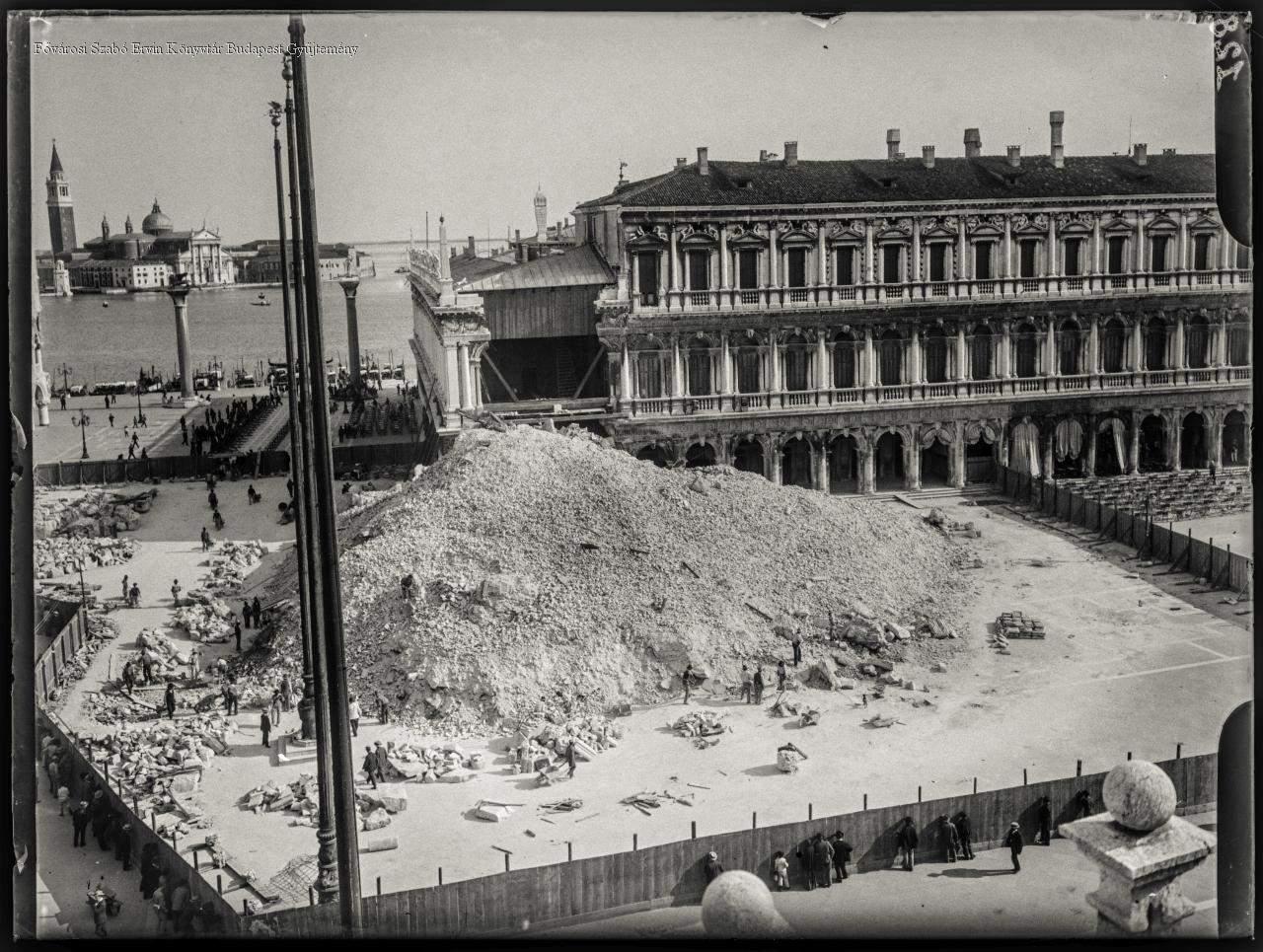 A többszörösen újáépített harangtorony alapozási hibák miatt 1902-ben összedőlt. A lábánál álló Loggetta megsemmisült, és a könyvtár épületének sarka is megzúzódott.