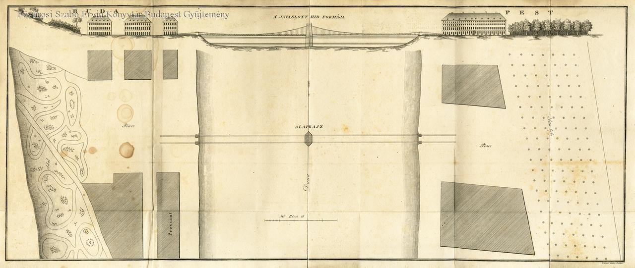 A tervezett híd oldalnézete, alaprajza, elhelyezkedése a két part között; a mederben középen egyetlen pillérrel tervezett híd. Meg nem valósult terv a Lánchíd elődje