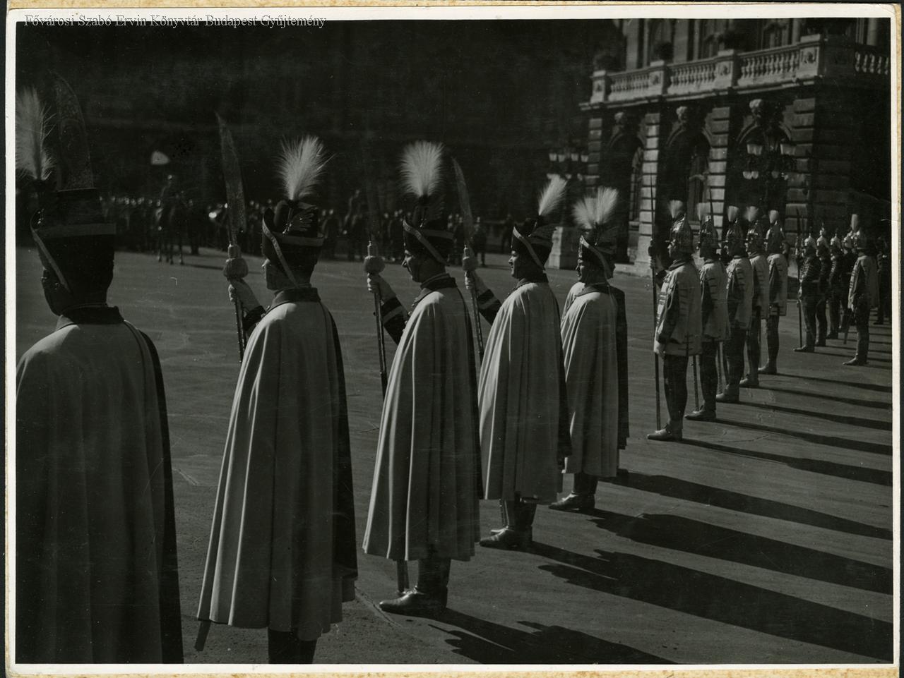 vár, díszszemle, fegyveres őrség, koronaőr, testőr, parlamenti őr, egyenruha, Horthy-korszak, sajtófotó, 1930-as évek
