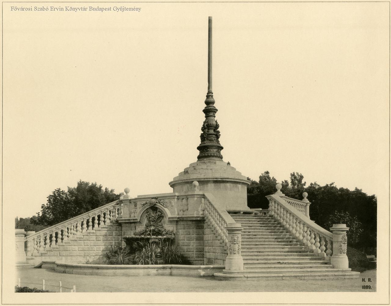Közeli felvétel. A Sugárút lezárására építette Ybl Miklós 1884-ben a Zsigmondy Vilmos feltárta artézi kút felett emelkedő, zászlórúddal lezárt építményt. Az ezredévi emlékmű építésekor a Széchenyi-hegyre helyezték át