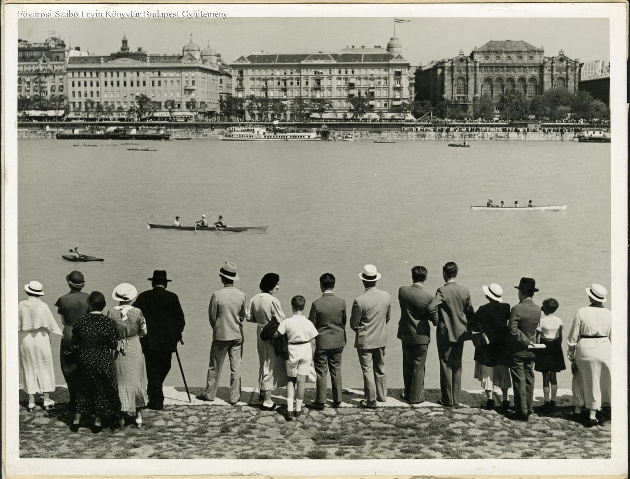[Evezősök, kajakos a Dunán, nézelődők a budai Duna-parton a Vigadóval szemben]