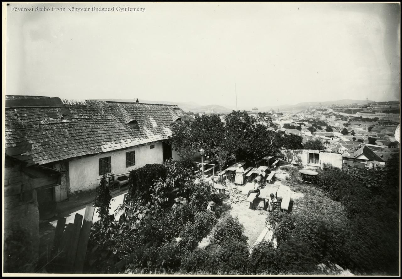 Tabáni ház udvara valószínű a Gellérthegy oldalában. Olvasó asszony, gyerekek. Látkép a Mátyás templom felé