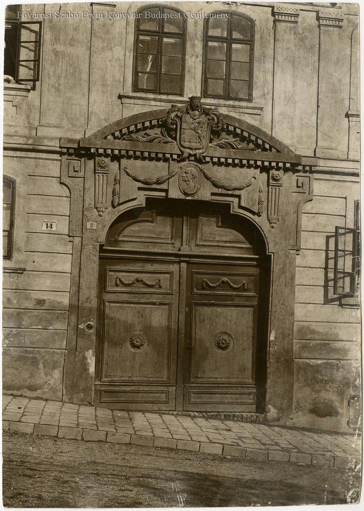 lakóépület, külső felvétel, kapu, copf stílus, dombormű, arckép, címer, házszámtábla, 1920-as évek