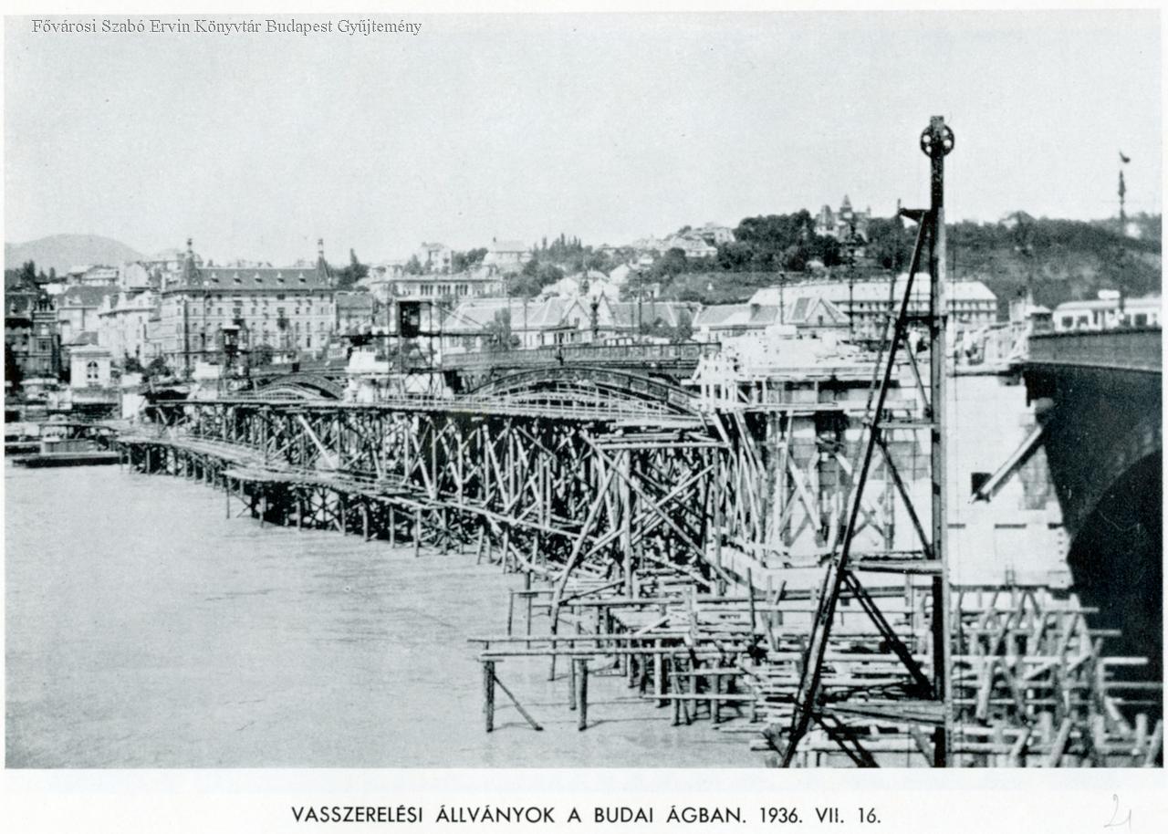 [A Margit híd átépítése, 1935-1937] Vasszerelési állványok a budai ágban : 1936. VII. 16.