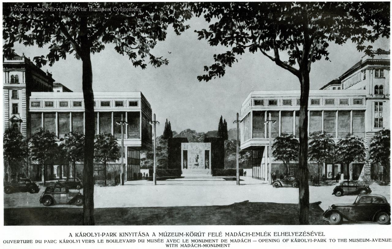 A Károlyi-park kinyitása a Múzeum körút felé Madách-emlék elhelyezésével Ouverture du parc Károlyi vers le Boulvard du musée avec le monument de Madách = Opening of Károlyi-Park to the Museum avenue with Madách-monument /