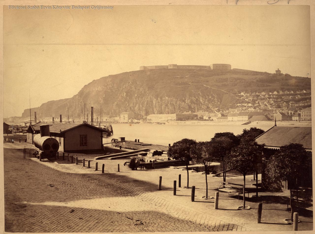 Faanyagok, pallók, korlátként használt facölöpök. Uszály. Szekéren talán gőzkazán. A Gellért-hegy aljában még kis lakóházak sorakoznak