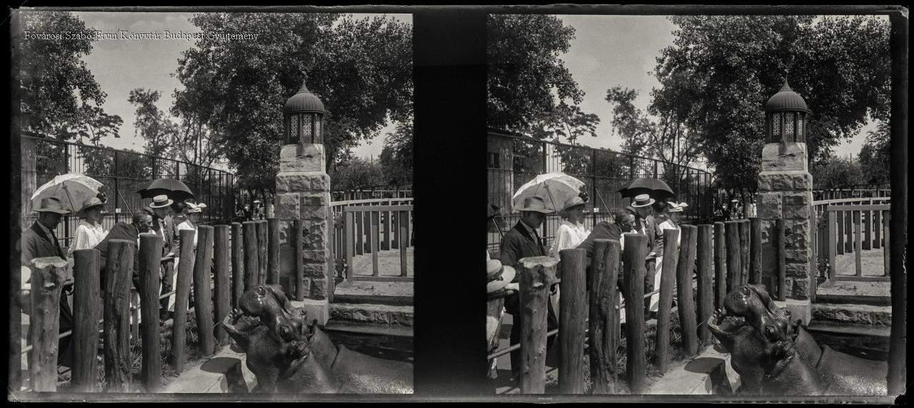 [Állatkert, látogatók a vízilónál] [Budapest Zoo, visitors at the hippo]