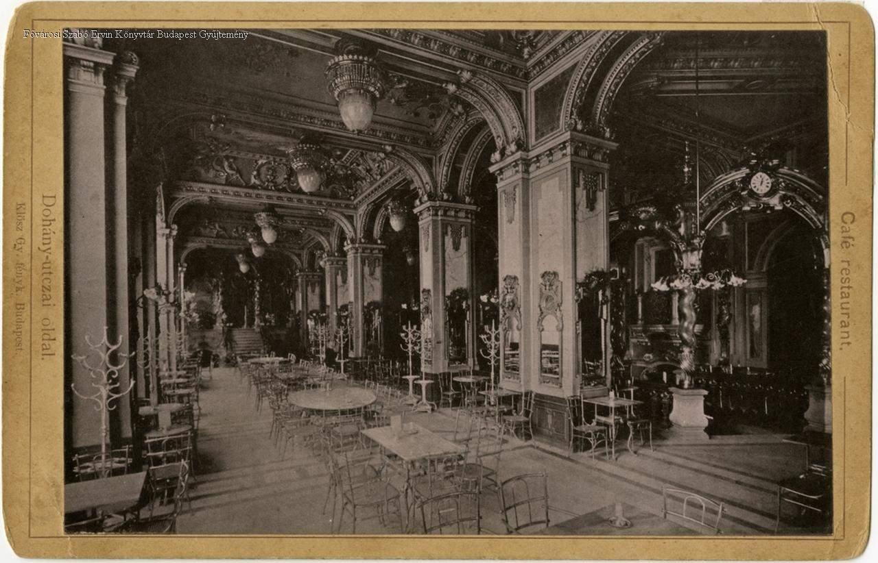 lakóépület, kávéház, asztal, szék, ruhafogas, tükör, csillár, lámpa, óra, aranyozás, épületdíszítés, faldísz, belső felvétel, 1890-es évek