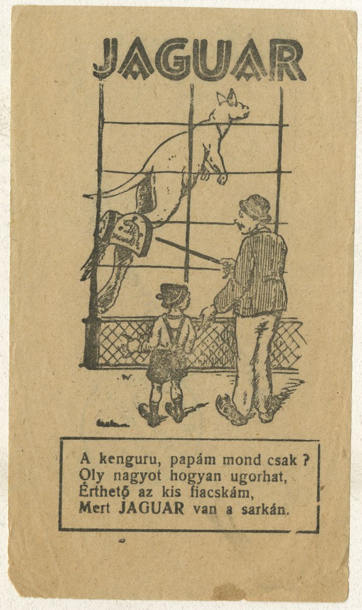 cipő, kaucsuk, gumi, embléma, jaguár, apa, gyerek, állatkert, kenguru, vers, reklámvers, reklámnyomtatvány, kisnyomtatvány, aprónyomtatvány, számolócédula
