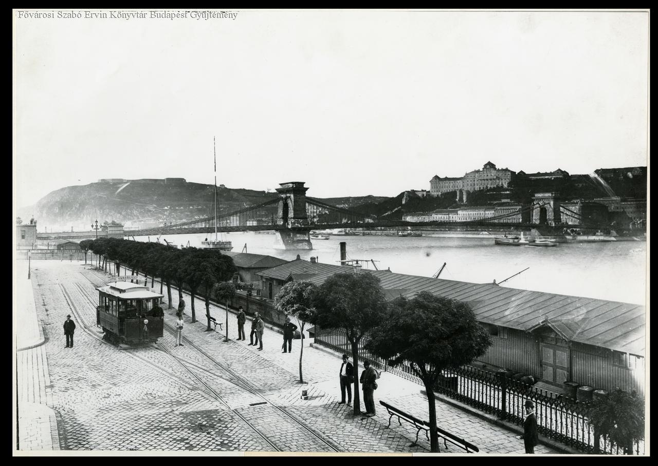 rakpart, kikötő, raktár, vasúti pálya, villamosmegálló, villamos kocsi, ember, közlekedési dolgozó, kalauz, közúti híd, ülőbútor, pad, kerítés, látkép, 1890 körül