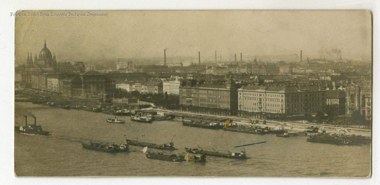 Lipótvárosi látkép a Gellérthegyről, balra a Magyar Tudományos Akadémia és az Országház épülete, jobb szélen a Vigadó épületének részlete, a Dunán uszályok haladnak, távolban gyárkémények