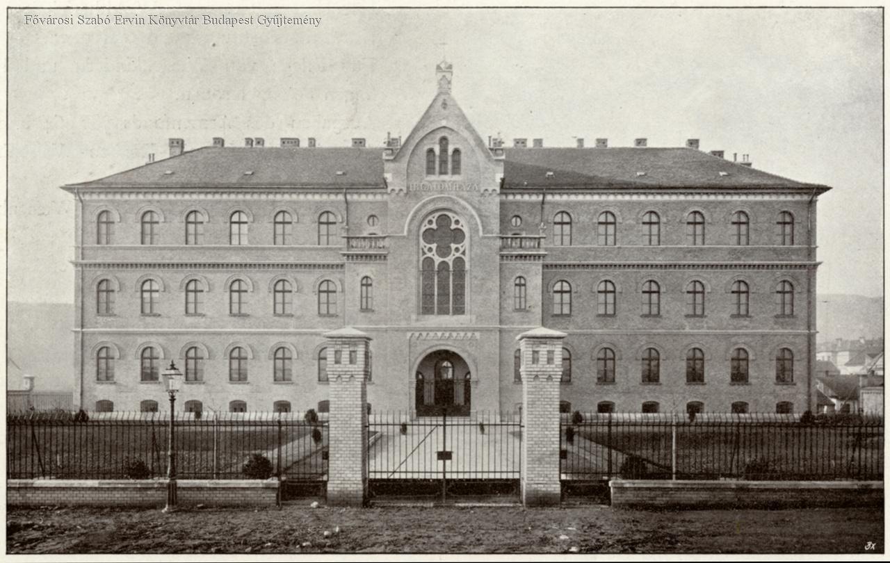 külső felvétel, épületkép, szociális intézmény, homlokzat, kapuzat, kerítés, 1899