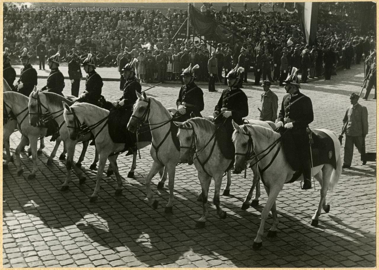 rendőr, lovasság, egyenruha, felvonulás, utcaseprő, munkavégzés, köztisztaság, néptömeg, sajtófotó, 1938