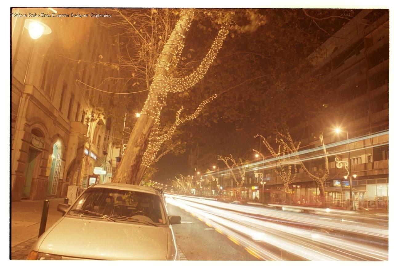 külső felvétel, utcakép, épületkép, este, közvilágítás, kivilágítás, karácsony, fa, személygépkocsi, 2000-es évek