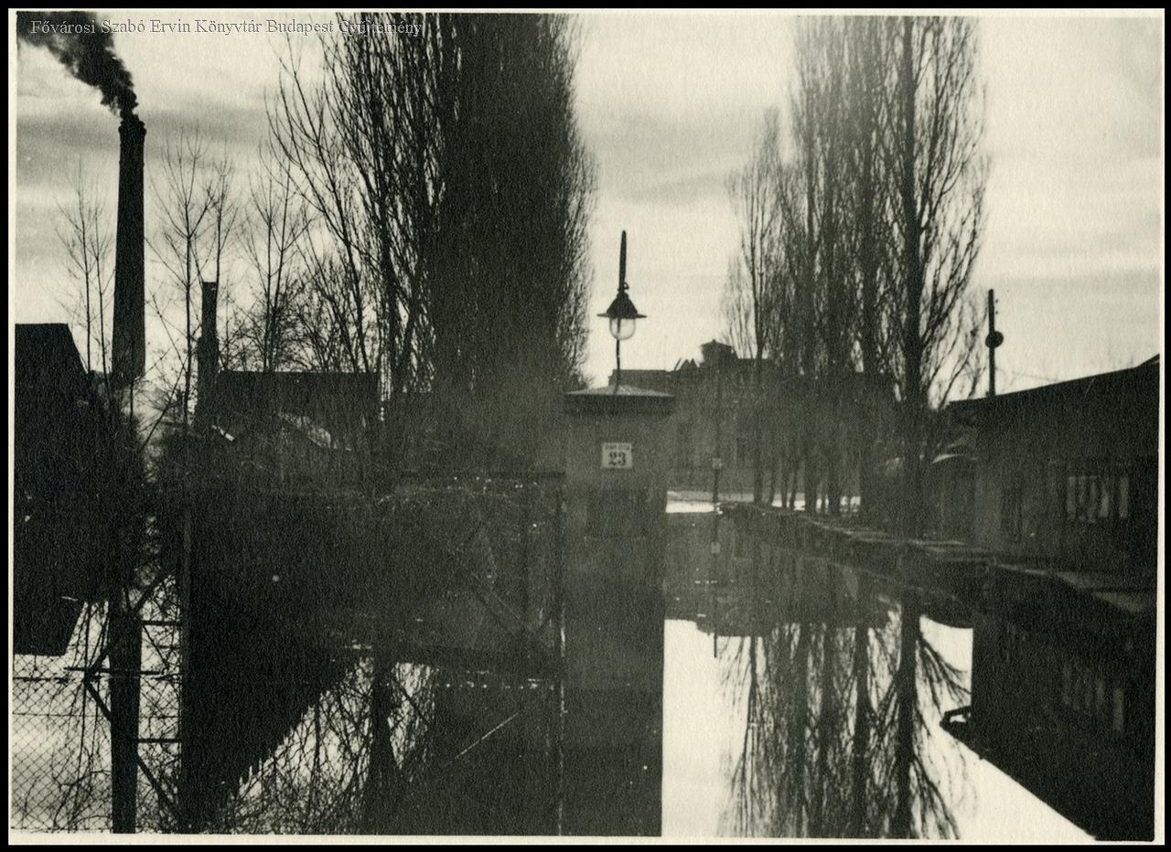árvíz, tél, ipari épület, kapu, fasor, gyárkémény, 1941