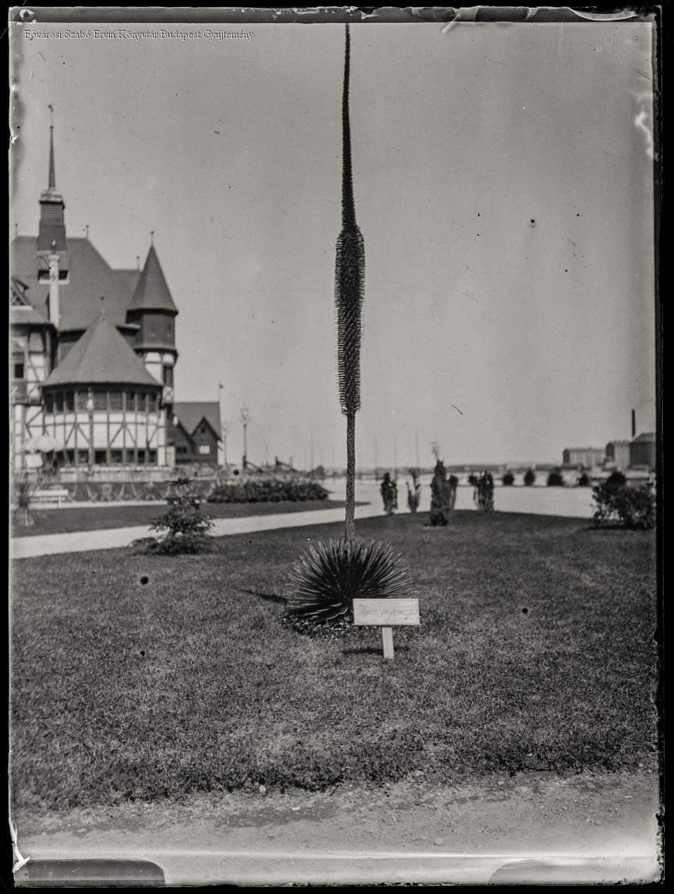 [Táblával megjelölt Agave filifera a Margitsziget déli bejáratánál, a kávéház előtt] [Agave filifera marked with a sign at the southern entrance of Margaret Island, in front of the café]