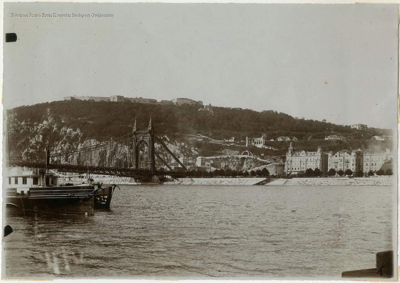 Az előtérben kikötőben várakozó hajók, mögöttük az Erzsébet-híd. A távolban a Gellérthegy oldalában a Szent Gellért lépcső, felette a Szent Gellért-szobor és a Citadella. A Döbrentei téren jobbra a Geist-bérpalota