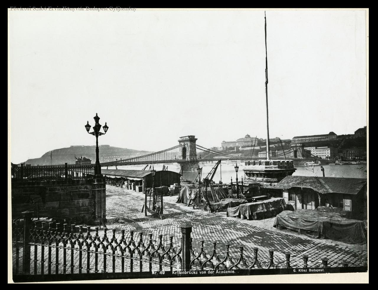 sárkány, szobor, híd, hídfő, rakpart, raktár, kikötő, lámpa, kerítés, látkép, 1877 körül