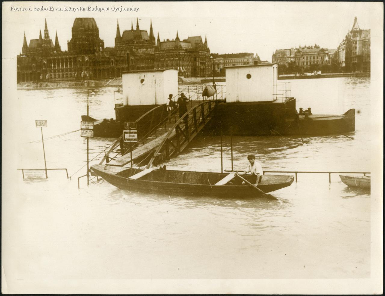 Árvizi jelenet, egy elöntött budai kikötőállomás, a háttérben a Parlament és környéke