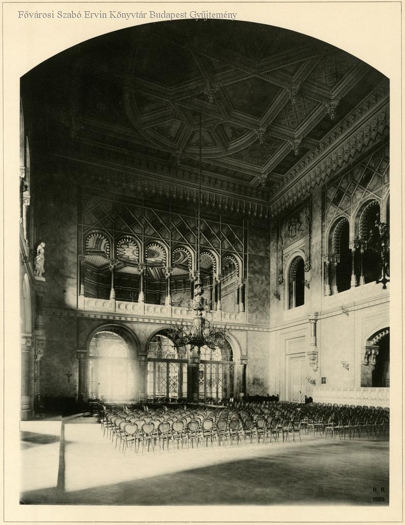 romantika, hangverseny, épületkép, közművelődési intézmény, bálterem, épületdísz, lámpa, szék, épületkép, belső felvétel, 1889