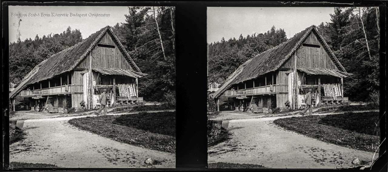 növényzet, fa, hegyvidék, falu, gazdasági épület, mezőgazdasági létesítmény, épület, ember, férfi, út, tornác, létra, 1900-as évek