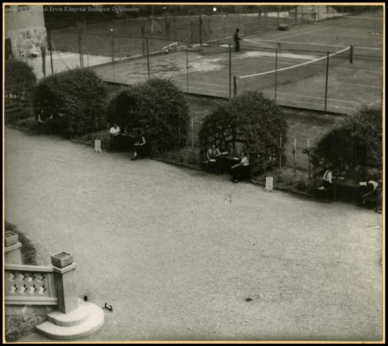 egyházi iskola, református egyház, középiskolás, lány, udvar, kert, ülőbútor, tanulás, sportpálya, teniszpálya, külső felvétel, 1934