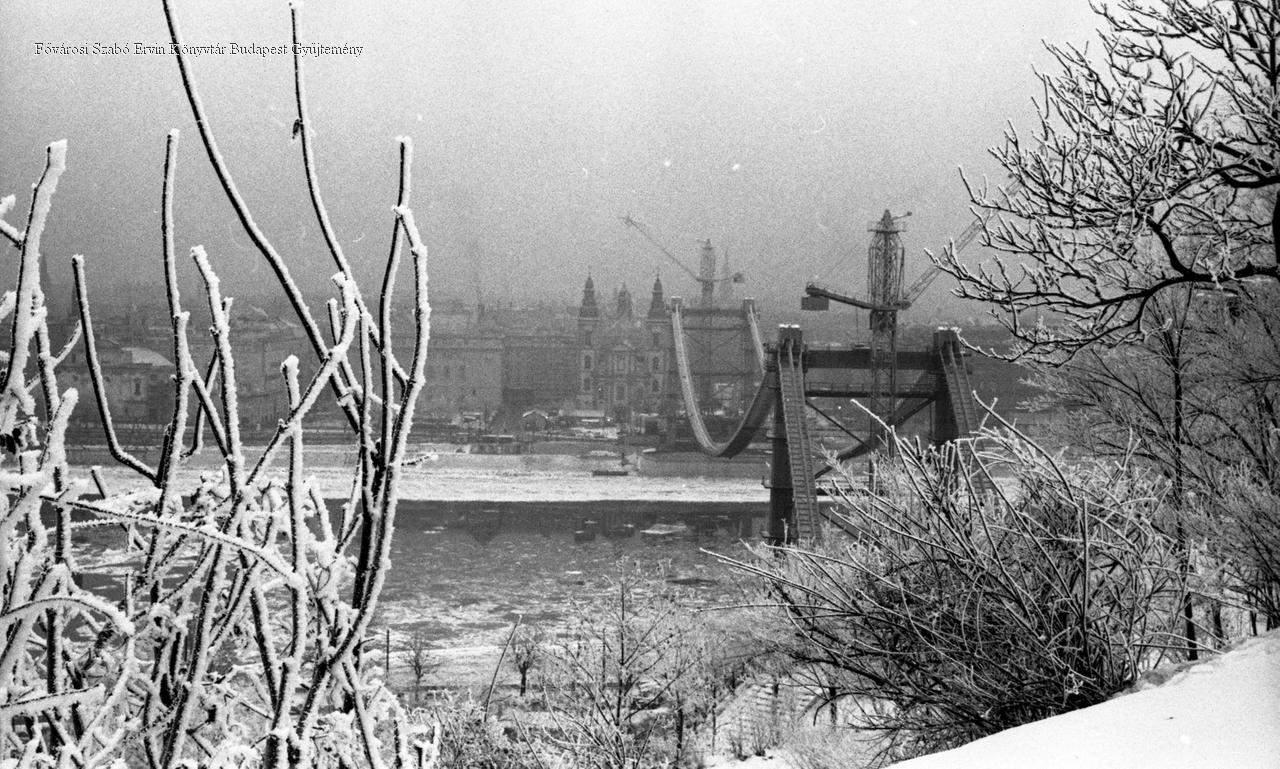 külső felvétel, látkép, hídépítés, daru, állvány, fa, hó, jég, tél, 1960-as évek