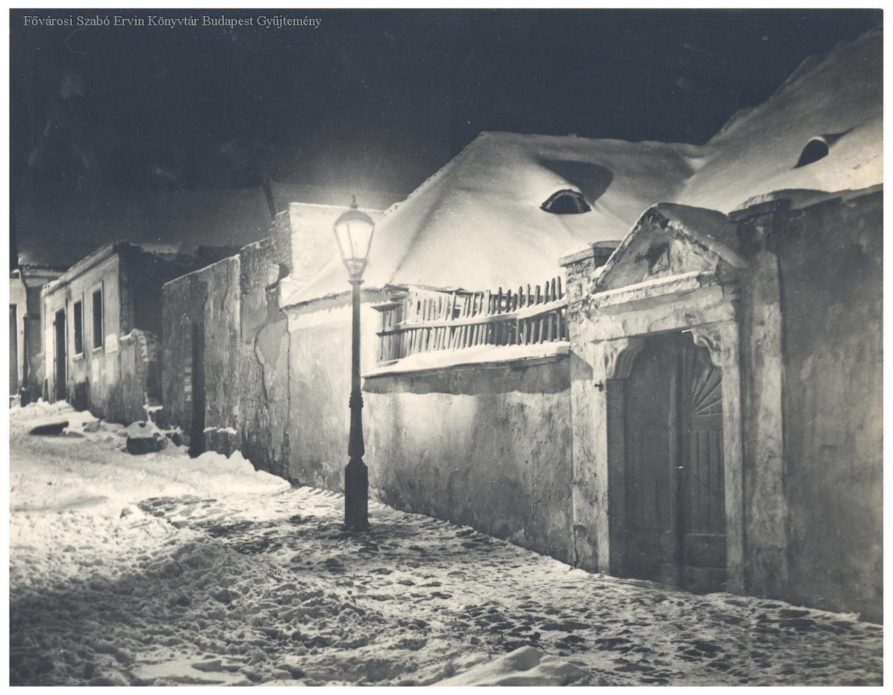 [Tabáni részlet, a Bocskay tér behavazott házai]