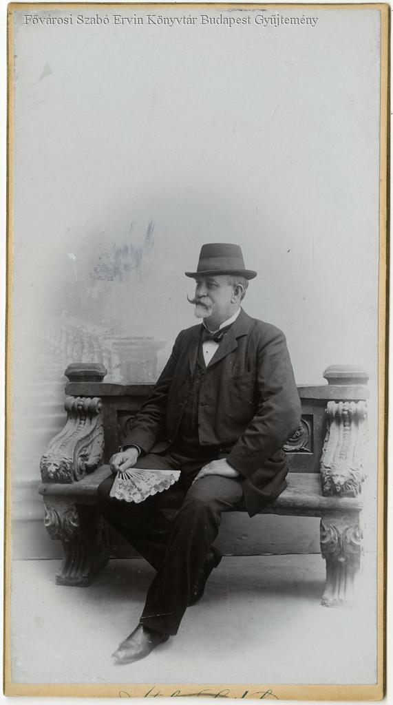 műtermi portré, férfi, egészalakos kép, ülőbútor, kávéház, vezető alkalmazott, vállalkozó, vendéglátás, legyező, 1899-es évek